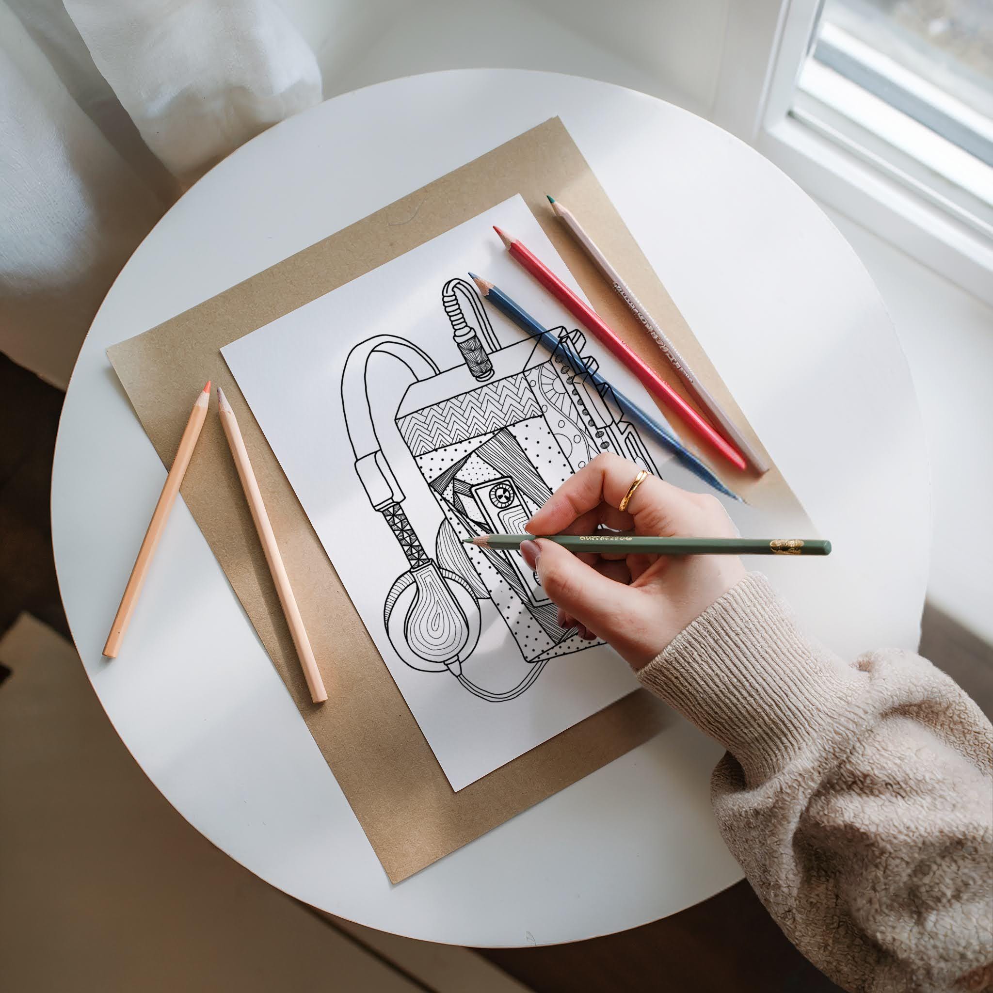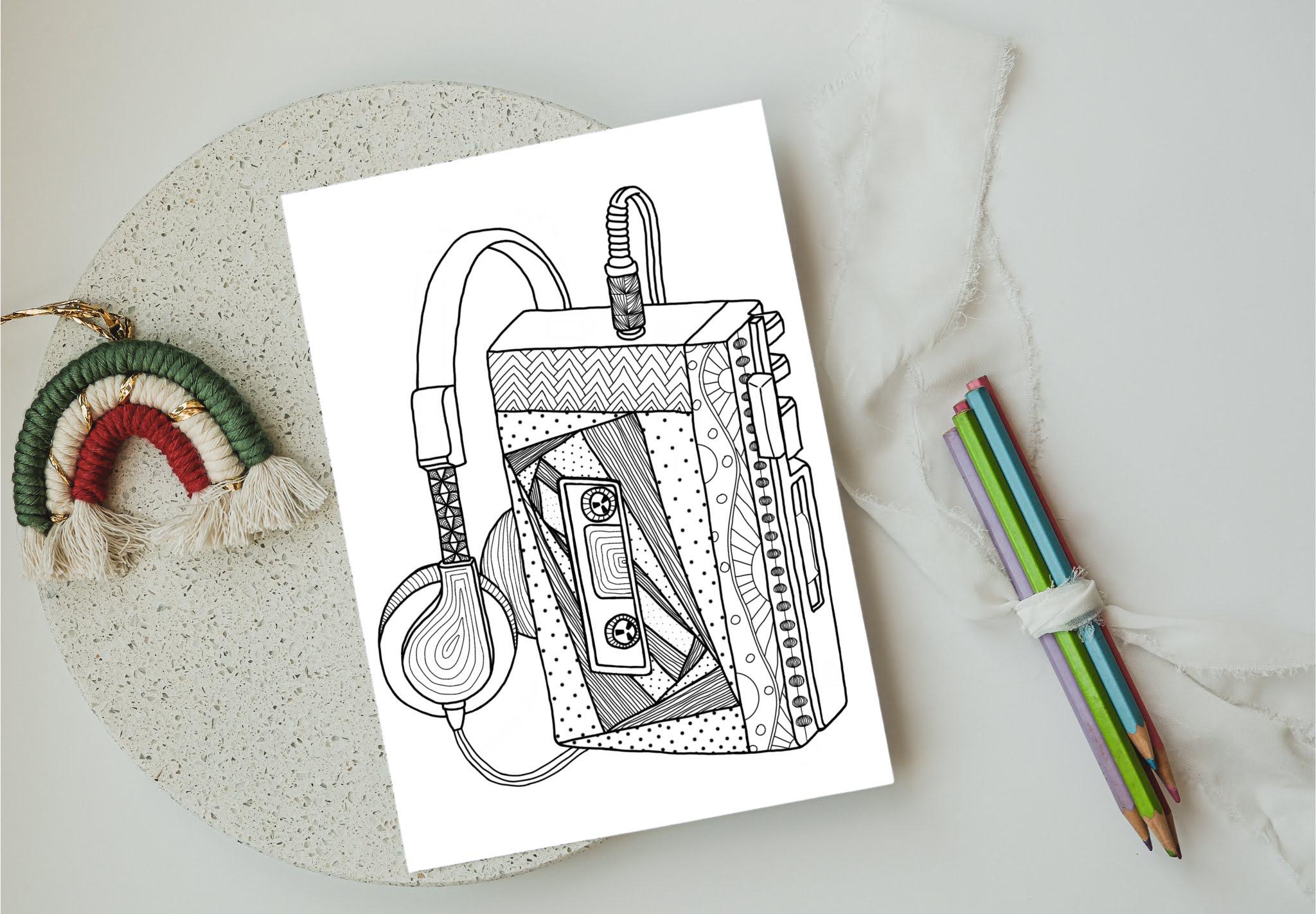 Unleash your creativity with this original Zentangle-inspired coloring page featuring a nostalgic personal cassette tape player in full play mode, complete with detailed wired headphones. Designed with intricate patterns and flowing lines, this printable artwork offers a relaxing and engaging coloring experience for adults and teens alike. Perfect for music lovers, retro enthusiasts, and fans of mindful art, this digital download adds a unique blend of vintage vibes and meditative design to your coloring collection. Ideal for printing at home and enjoying with your favorite coloring tools.