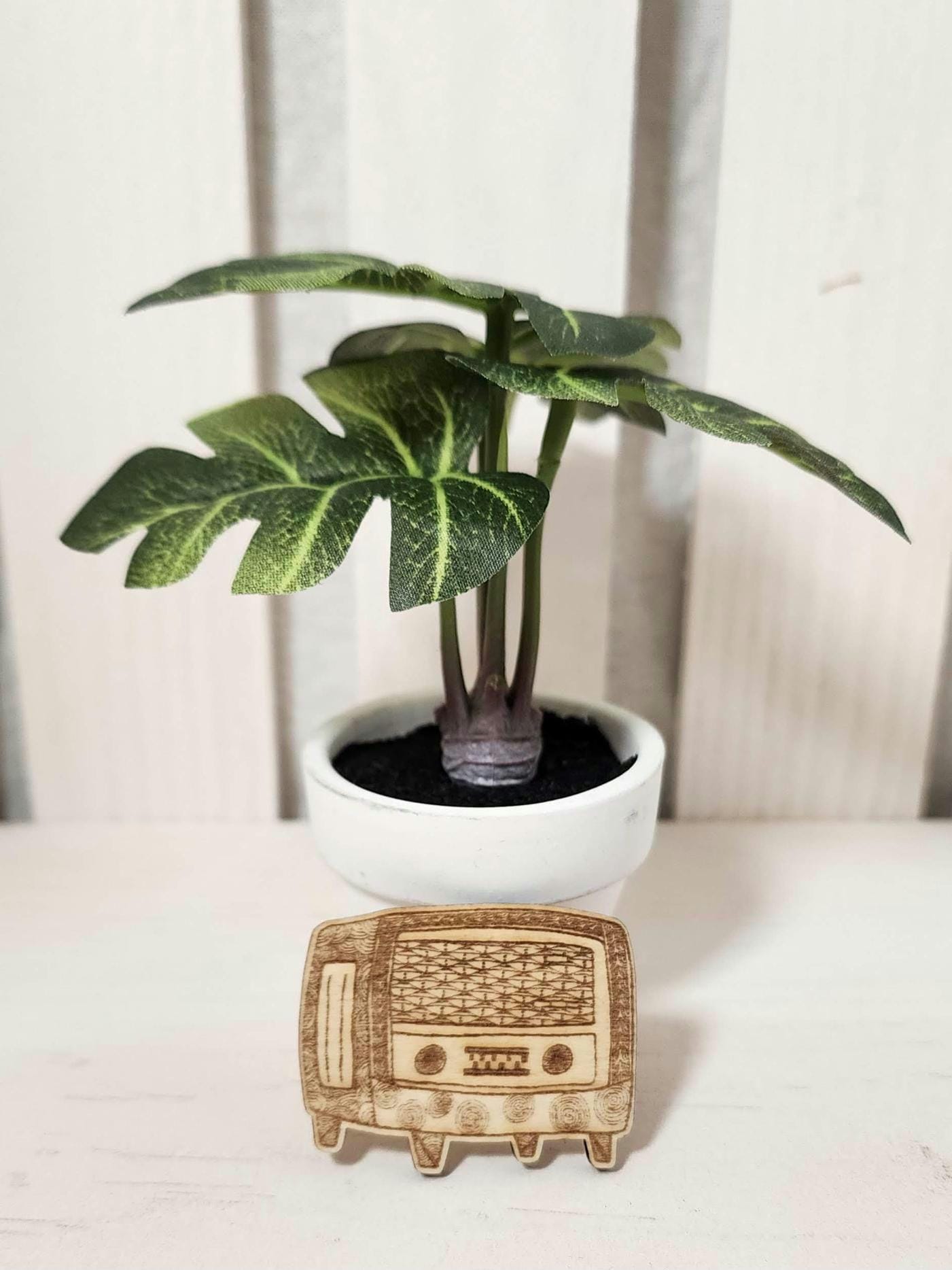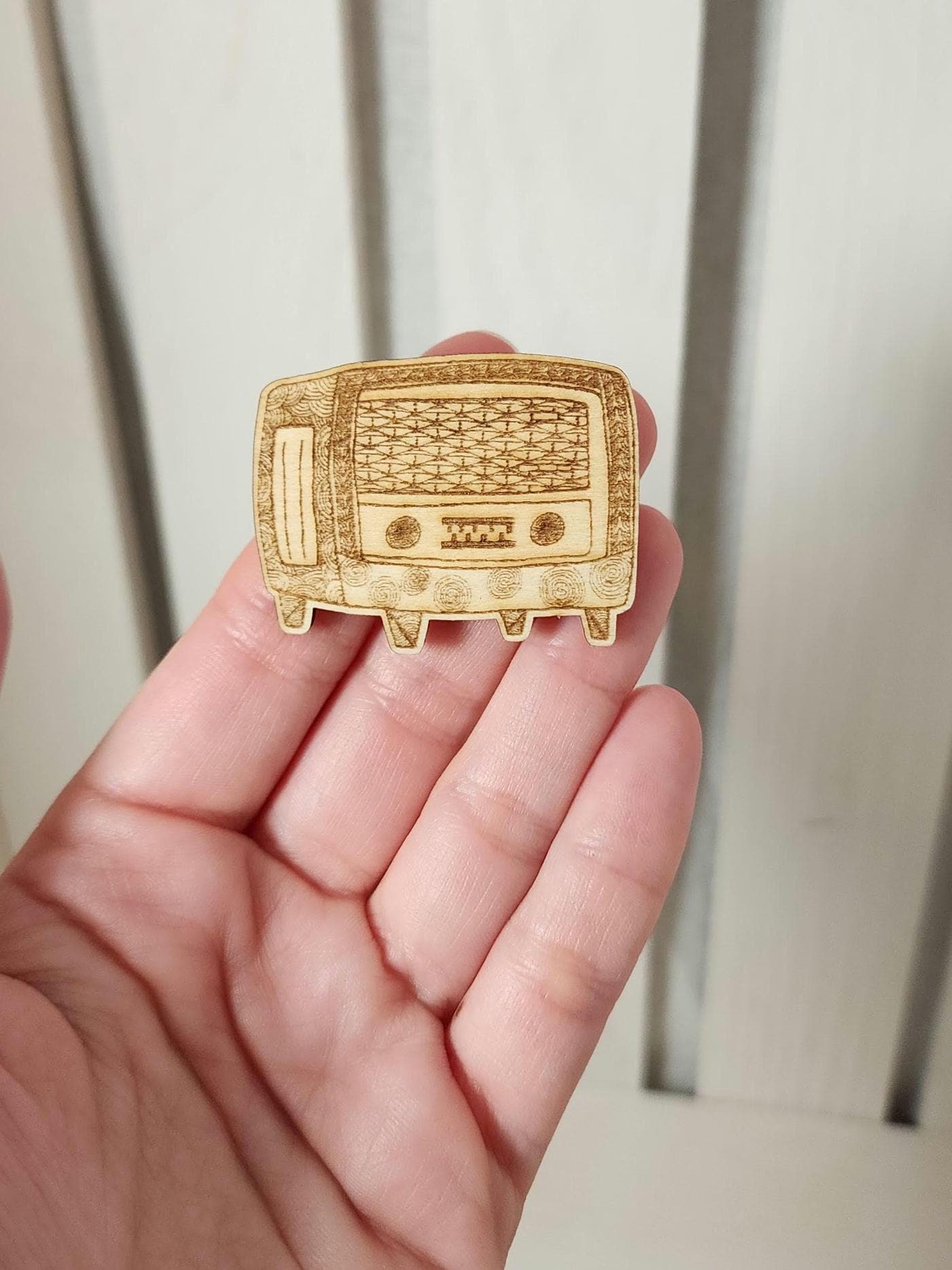 Capture the charm of the past with this Retro Radio Pin, intricately laser engraved on wood to showcase Zentangle-inspired artwork. Its bright green soft pin back adds a vibrant pop of color, making it a nostalgic and whimsical accessory that stands out while being comfortable. Perfect for vintage lovers, this unique pin combines a vintage 20s and 30s radio design with detailed, modern craftsmanship for a playful yet timeless look.