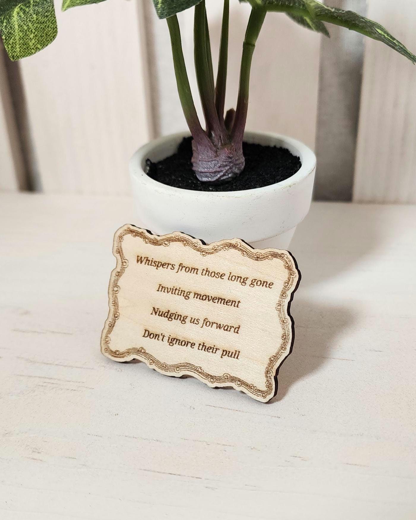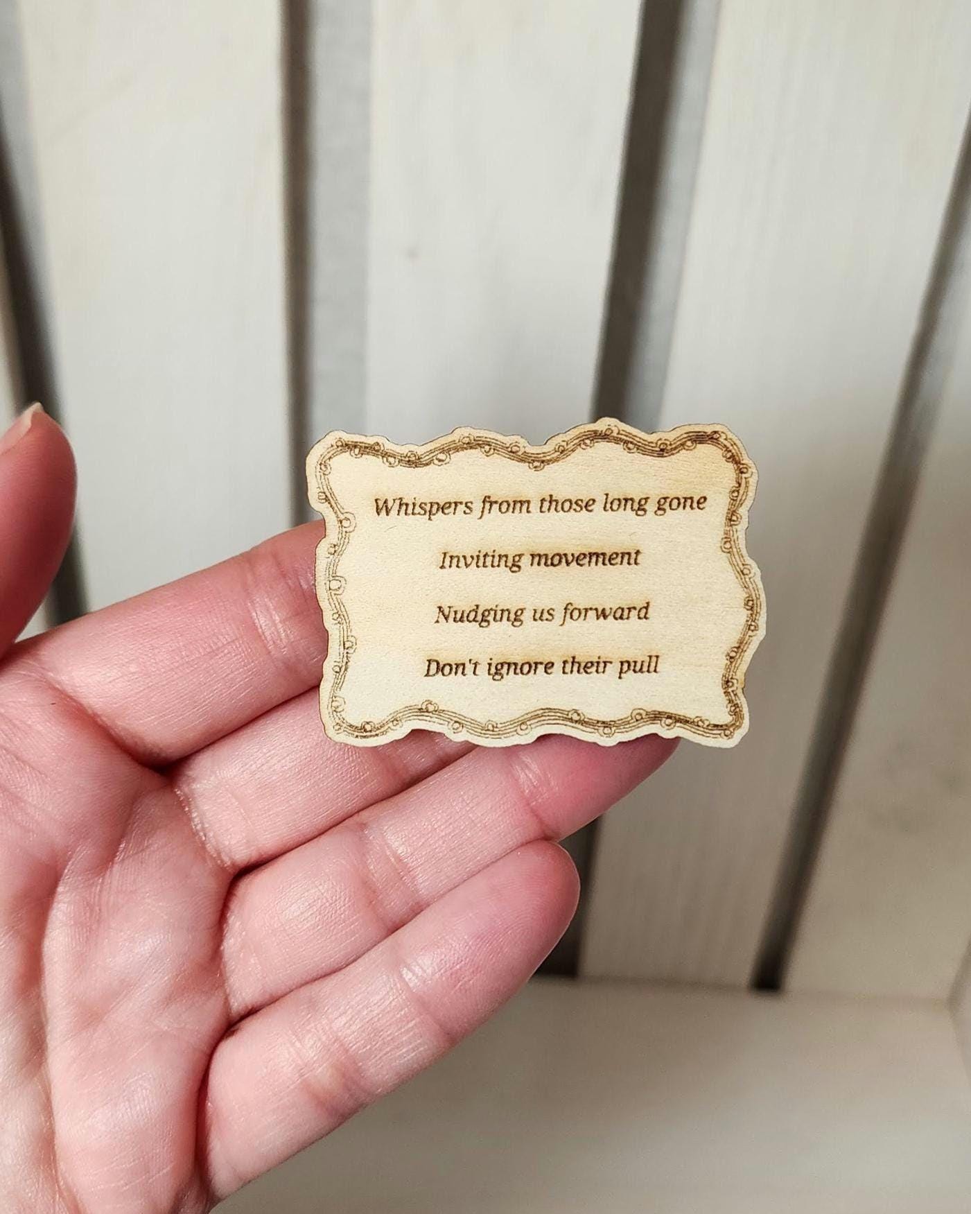 Honor the gentle whispers of loved ones with the "Wind" Tangled Thoughts Poetry Pin. This laser-engraved wooden pin showcases my original poem "Wind" about messages from those who have passed, surrounded by delicate Zentangle-inspired designs. Equipped with a bright green soft rubber pin back, it offers both comfort and secure wear—a heartfelt reminder of connection and enduring love.